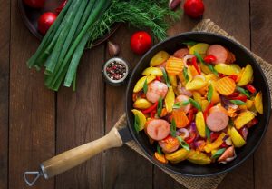 • قومى بتقطيع السجق وضعيه في صينية مع البطاطس والطماطم والصلصة ومكعبات المرق